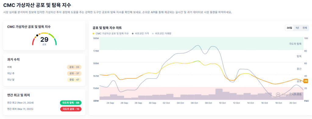 트럼프 대통령이 “시진핑 주석과 한국에서 만날 수도, 아닐 수도 있다”고 발언하자 시장은 급격히 냉각됐다. 공포·탐욕 지수는 25~33 수준(공포 단계)으로 하락했다.