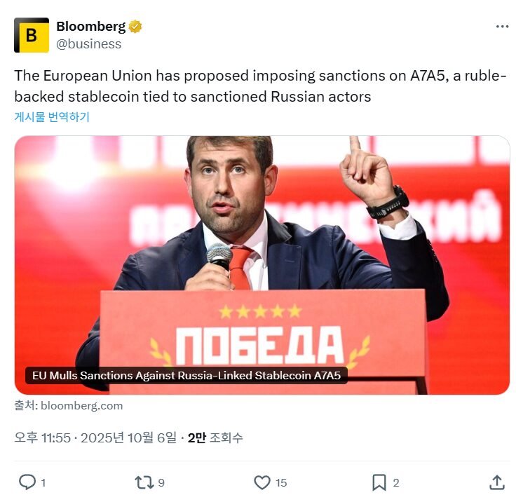 A7A5의 폭발적 성장에 유럽연합(EU)도 대응에 나섰다. 블룸버그가 입수한 내부 문건에 따르면, EU는 A7A5 및 관련 은행에 대한 직접적·간접적 거래 금지 제재안을 마련했다.