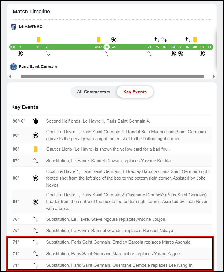 • 변화(교체): 후반 71분, 브래들리 바르콜라와 우스만 뎀벨레를 동시에 투입하며 공격 속도와 1대 1 돌파 빈도 급증, 측면 전개 활성화와 박스 내 혼전 상황 증가.