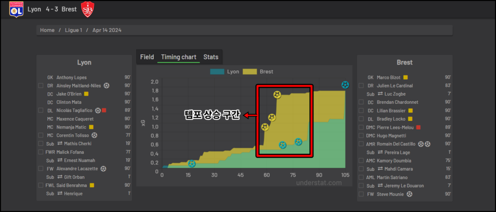 • 변화(템포 상승): 후반 60분 이후 브레스트가 약 7분간 공격 템포를 급격히 끌어올리며 연속 3골 기록. 이에 리옹도 즉각 반응하며 짧은 시간 안에 2골을 추가