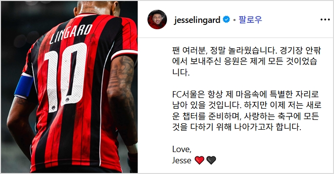 린가드는 SNS 메시지를 통해 팬들에게 작별을 고했다. 그는 “한국에서 보낸 시간은 정말 놀라웠다. 축구와 분위기, 이 클럽을 둘러싼 열정은 최고였다”며 “지난 2년 동안 보내준 사랑과 응원, 따뜻한 격려는 잊지 못할 것”이라고 남겼다. 또한 “서울에서의 경험을 소중히 간직하며 새로운 챕터를 향해 나아가겠다”고 덧붙였다.