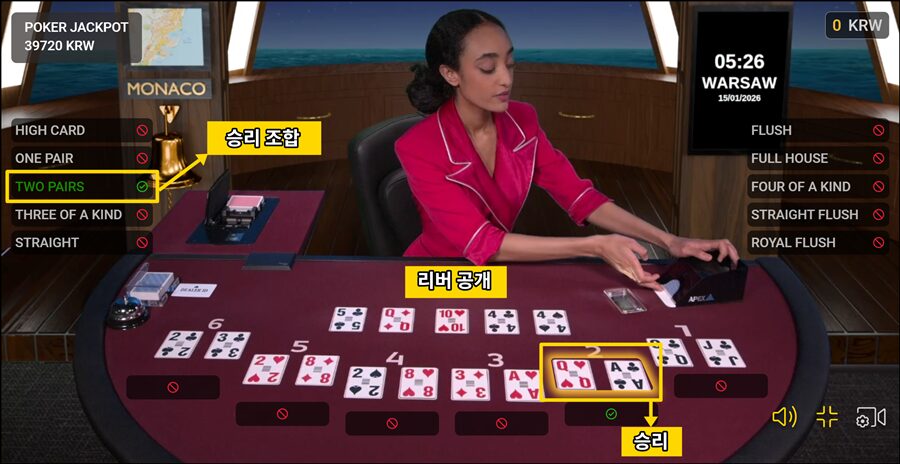 또한 승리한 핸드가 어떤 족보 조합으로 승리했는지가 사이드 영역에 ✔️ 표시와 안내되며, 해당 승리 조합을 정확히 예측한 플레이어에게도 추가 당첨금이 지급됩니다.