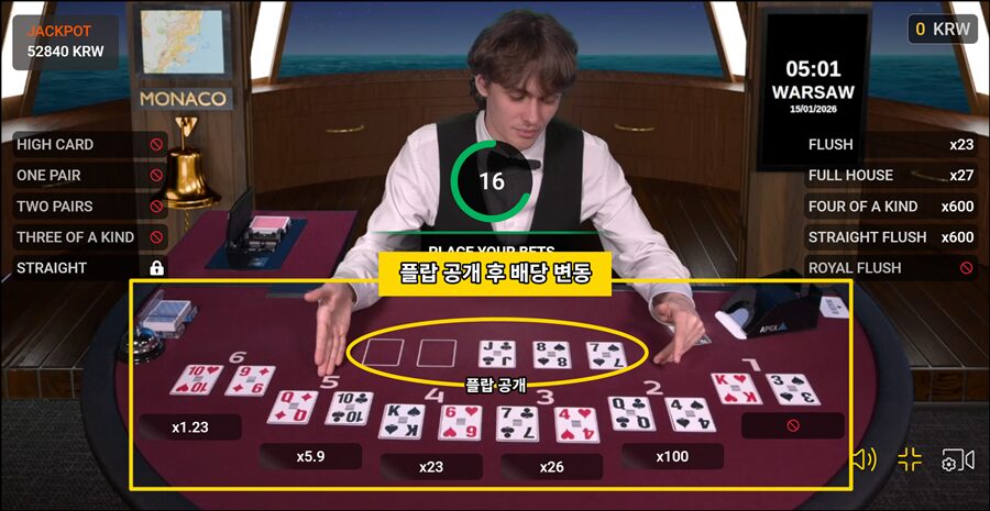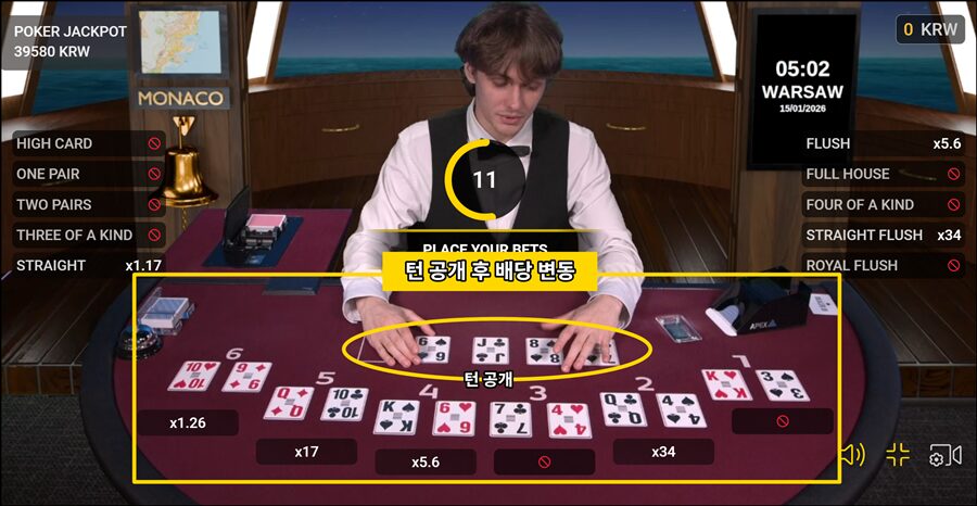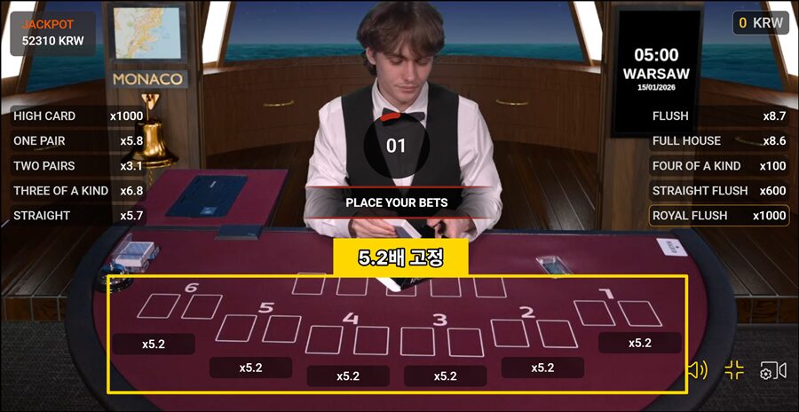 이 단계에서는 카드 정보가 없기 때문에 모든 핸드의 배당률은 5.2배로 동일하며, 매 게임의 고정 배당으로 제공됩니다.