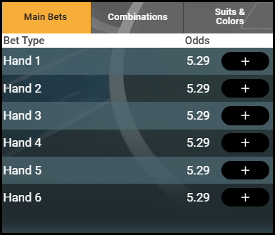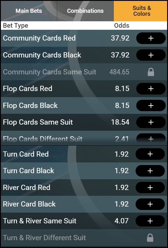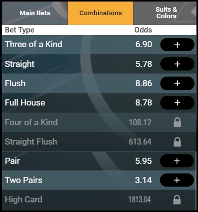 4. 핸드 베팅 외에도, 승리 조합(Combinations), 무늬&색깔(Suits & Colors) 등장 여부(플레이텍 벳 온 포커 한정)에 대해서도 베팅 가능