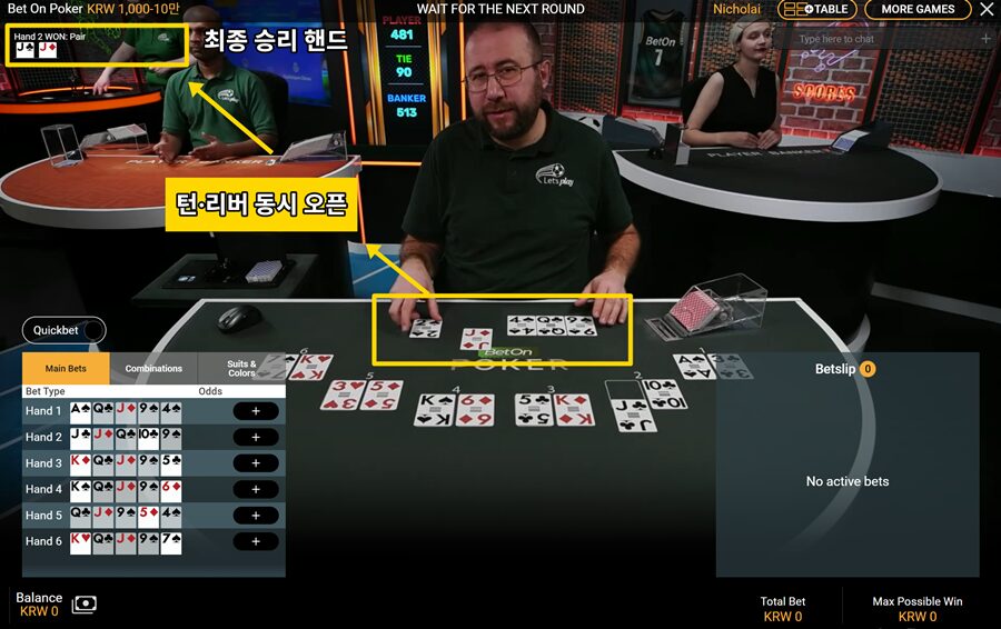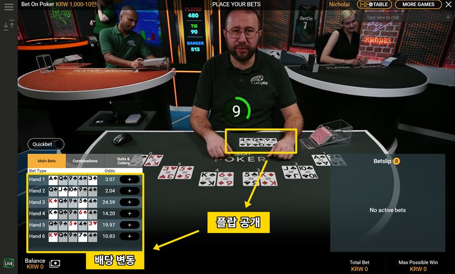 좌측 하단의 Main Bets-Bet Type 영역에서 각 핸드가 어떤 카드를 받았는지와 배당 변동을 확인할 수 있습니다.