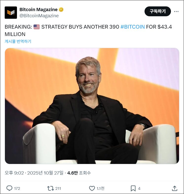 기관 투자자들의 유입 역시 뚜렷하다. 비트코인 현물 ETF에는 10월 한 달간 10억 달러 이상이 순유입됐고, 전략기업(Strategy)은 최근 4천3백만 달러 규모(약 630억 원)의 비트코인 390개를 추가 매입해 보유량을 64만 개 이상으로 늘렸다. 이는 비트코인을 ‘기업 재무자산’으로 인정하는 흐름이 본격화됐음을 상징한다.