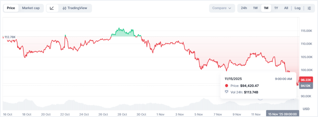 비트코인이 6개월 만에 9만5천 달러 아래로 떨어지면서 가상자산 시장 전반에 경고등이 켜졌다. 지난달 기록한 사상 최고가 12만6천 달러대와 비교하면 약 25% 급락한 수준으로, 위험자산 전반의 매도세와 연준의 금리 인하 기대 약화가 동시에 작용한 결과로 보여진다.