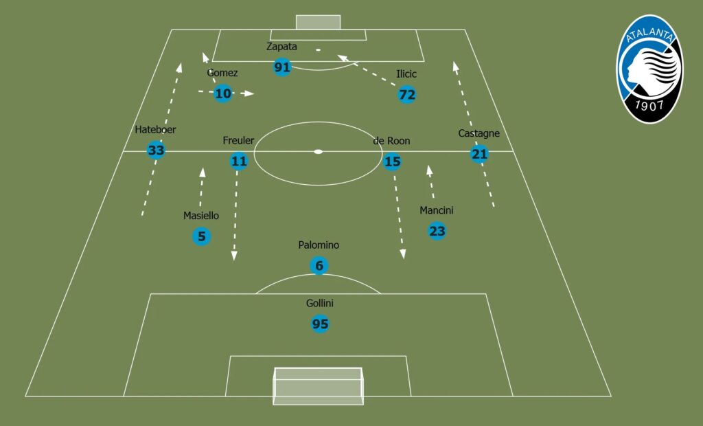 미드필더 한 명을 더 공격적으로 배치하고 측면 활용 비중을 높이자, 아탈란타의 수비 라인은 점차 간격이 벌어지기 시작했습니다.