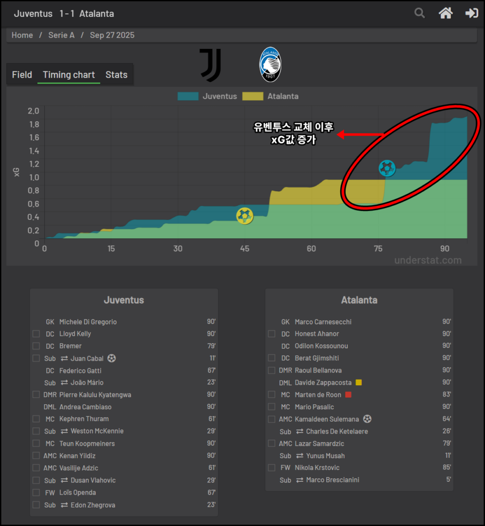 이 변화 이후 유벤투스는 전반과는 전혀 다른 템포로 공격을 전개하며 득점 기회를 만들어냈고, 결과적으로 경기의 승부처는 전반이 아니라 후반의 선택에서 갈렸습니다.