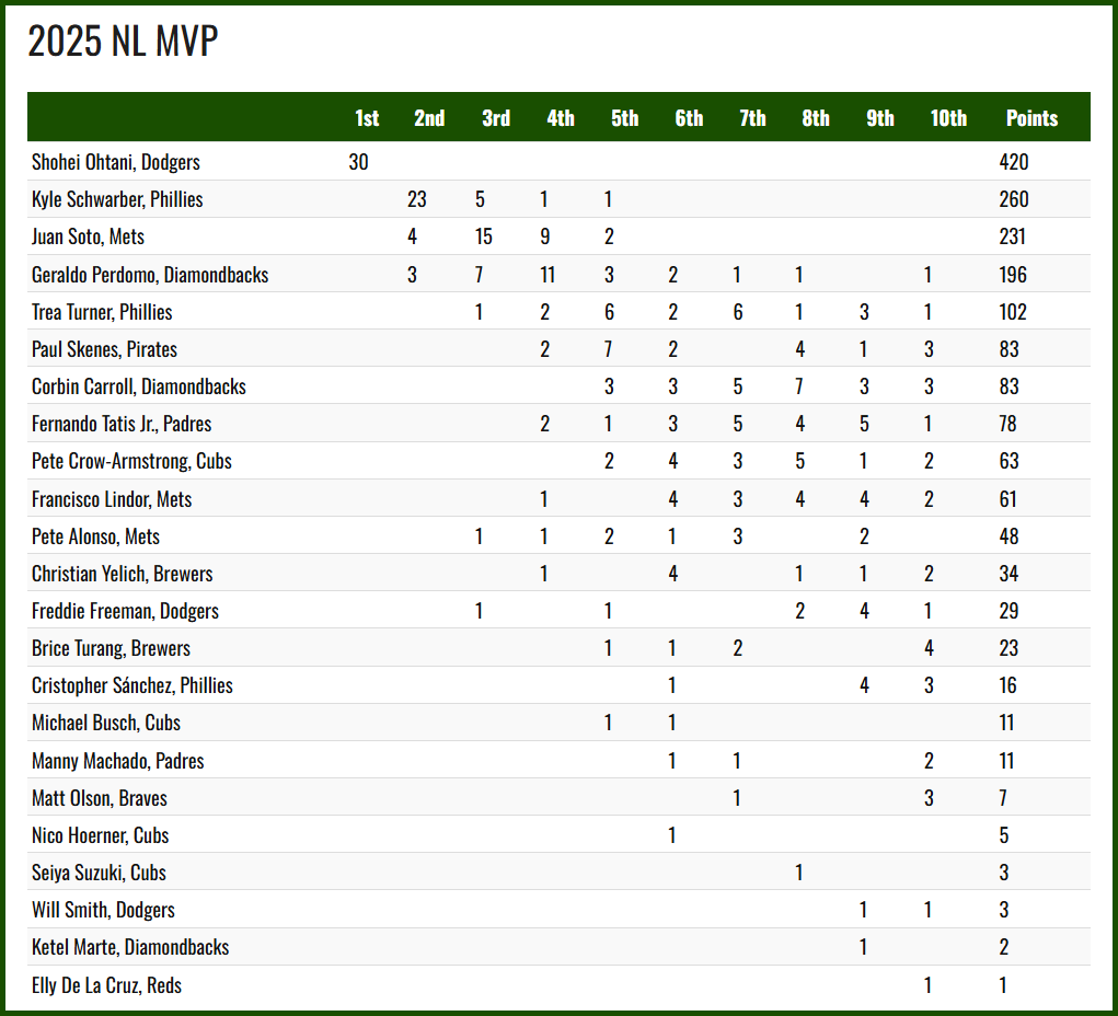 2025 미국 메이저리그 NL(내셔널리그) MVP 투표 결과 /BBWAA