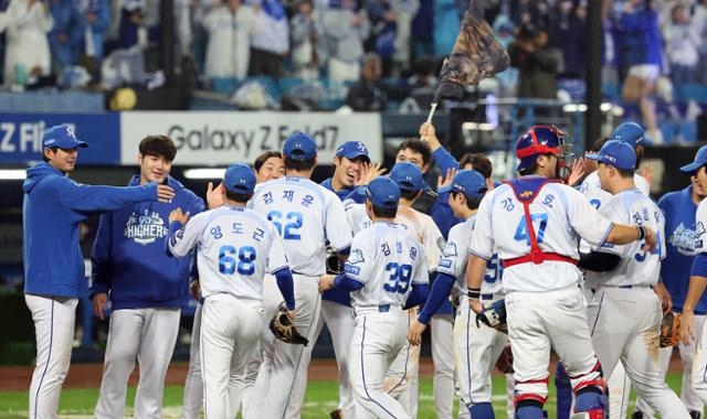 승리 후 기뻐하는 삼성 선수들 / 출처 : 뉴스1