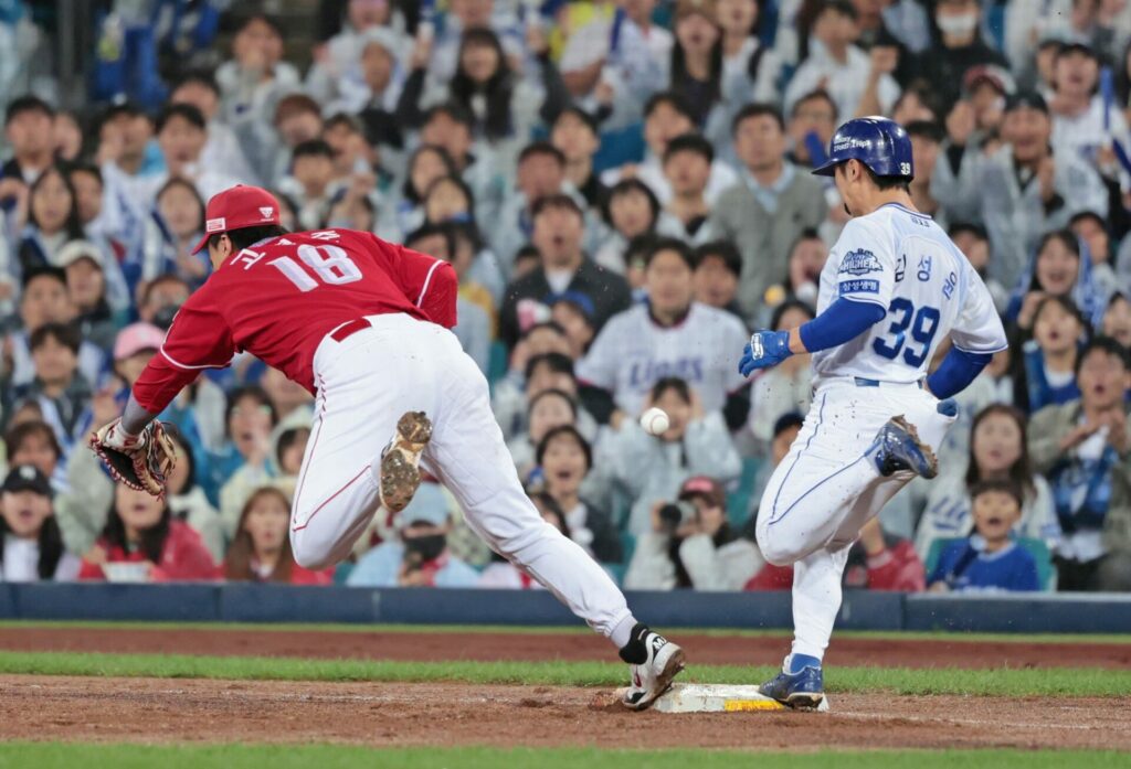 3회 초, 안상현의 송구가 빠지며 김성윤이 1루 베이스를 밟았다 / 삼성 라이온즈 제공