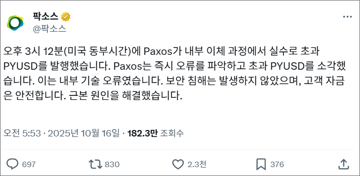 다행히 팍소스는 사고 발생 후 22분 만에 토큰 전량을 소각하며 사태를 수습했지만, 업계는 충격에서 쉽게 벗어나지 못했다.