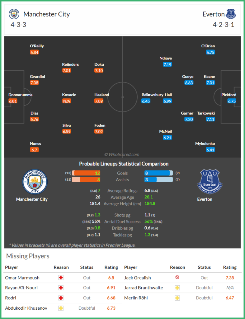 1. 전술 구도 : 맨시티는 짧은 패스 중심의 점유율 전술로 경기 템포를 장악하려 할 것이며, 에버튼은 롱볼과 세트피스를 중심으로 공중전을 유도할 가능성이 높다.