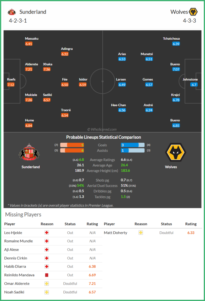 - 경기 양상 예측 : [전반] 울버햄튼이 점유를 가져가며 경기 주도 → [중반] 선덜랜드가 롱볼과 세트피스로 반격 → [후반] 피지컬 싸움 중심의 공방전 예상