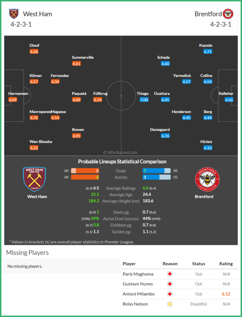 한국시간 10월 21일 EPL 8라운드 웨스트햄 유나이티드 FC vs 브렌트포드 FC 경기 예상 라인업 / 출처 : 후스코어드닷컴