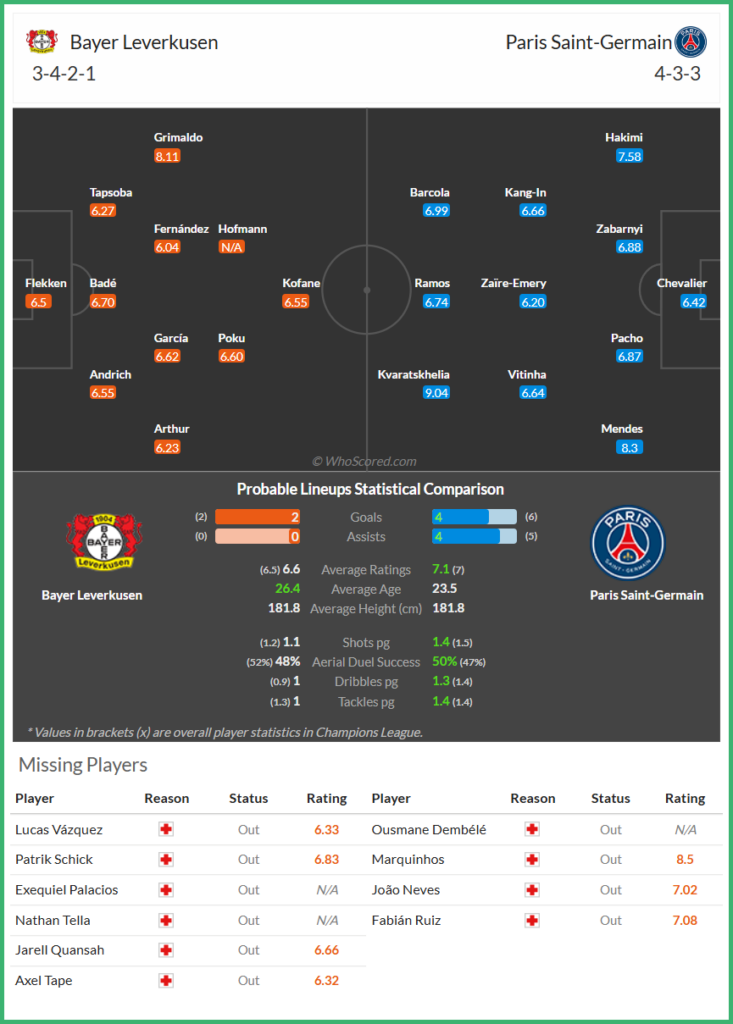 - 경기 양상 예측 : [전반] PSG가 높은 점유율로 압박과 레버쿠젠은 역습 및 세트피스로 위협 → [중반] PSG 중거리 및 패스 연계로 기회 만들지만, 레버쿠젠 속공에 노출 → [후반] 원정팀 파리의 체력 소모로 인해 레버쿠젠이 공간 활용 극대화, PSG는 개인기 기반으로 재역습