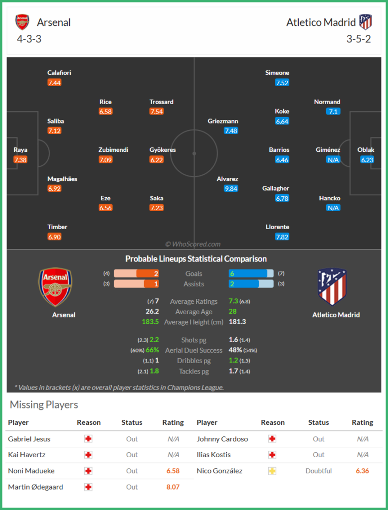 - 경기 양상 예측 : [전반] 아스날이 주도하고 점유율을 높게 가져갈 가능성 높음 → [중반 이후] 아틀레티코 마드리드가 역습 또는 세트피스를 통한 찬스를 노릴 것