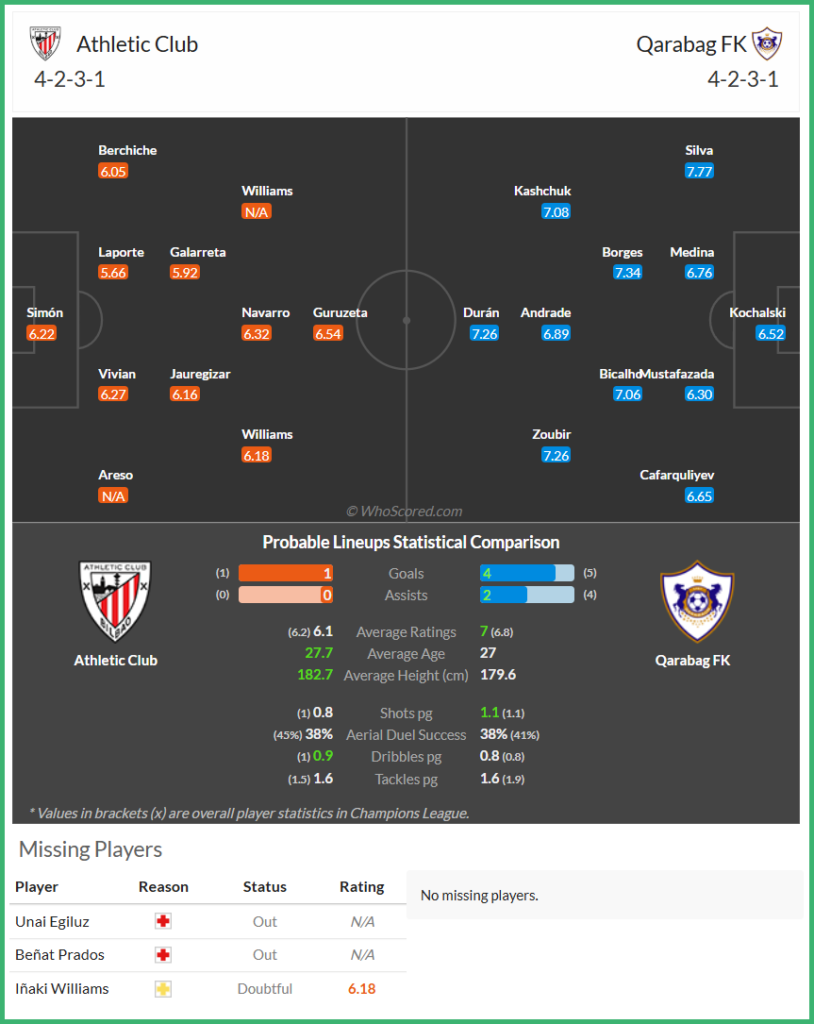 3. 리드 유지 및 수비 운영 : 빌바오는 먼저 리드를 잡더라도 경기 운영력과 수비 집중력 유지가 관건이다. 반대로 가라바흐는 뒤처지는 경우에도 정신력과 반격 능력이 뛰어나기 때문에 역전 가능성이 항상 열려있다.