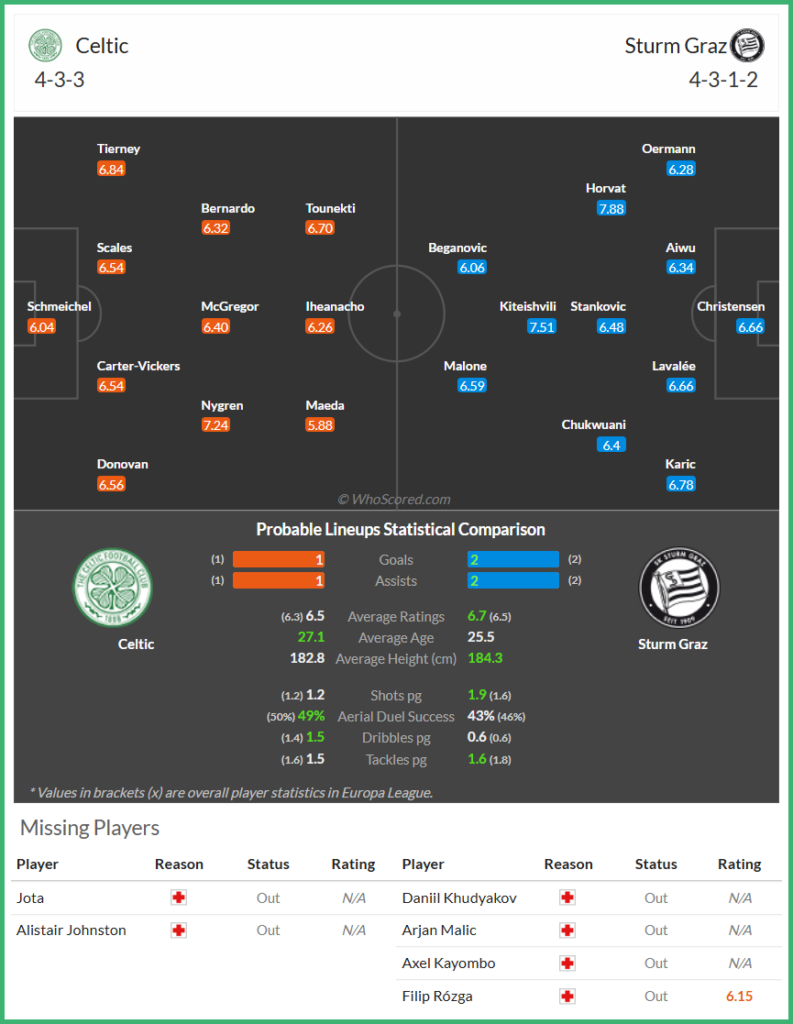 2. 슈투름 그라츠의 전방 압박 및 역습 vs 셀틱의 빌드업 리스크 : 셀틱은 후방에서부터 짧은 패스로 전진하지만, 전방 압박 전술을 내세운 슈투름 그라츠가 강한 압박을 걸면 셀틱이 실수로 인한 역습을 허용할 위험이 있다.