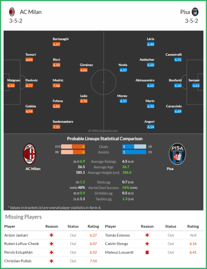 한국시간 10월 25일 세리에 A 8라운드 AC 밀란 vs 피사 SC 경기 예상 라인업 / 출처 : 후스코어드닷컴