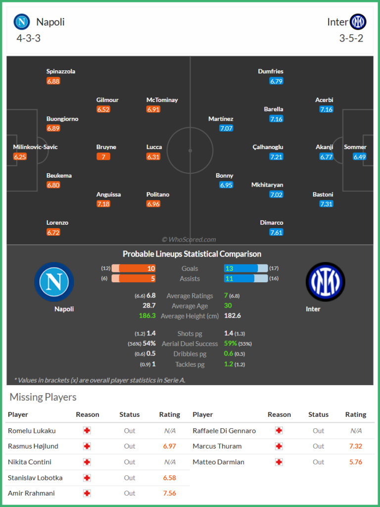 1. 점유율 : 나폴리와 인테르는 모두 ‘짧은 패스 전개 + 중앙 공격 지향 + 점유 중시’ 전술을 구사한다. 빌리 길모어-케빈 더 브라위너-잠보 앙귀사 vs 헨릭 미키타리안-하칸 찰하놀루-니콜로 바렐라의 중원 싸움이 경기의 핵심 축이 될 전망이다.