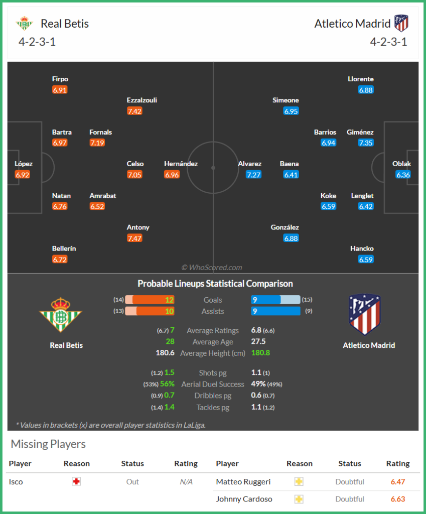 한국시간 10월 28일 스페인 라리가 10라운드 레알 베티스 vs 아틀레티코 마드리드 경기 예상 라인업 / 출처 : 후스코어드닷컴