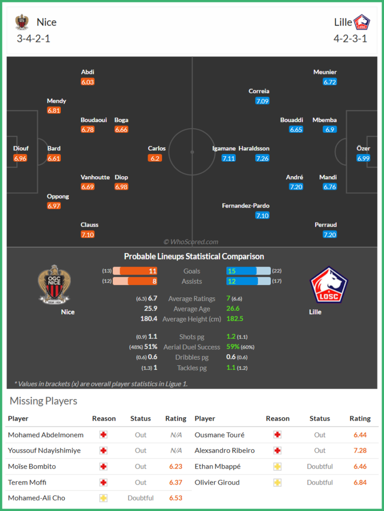 2. 공중볼 싸움 : 릴이 공중 경합에서 압도적인 우위를 가져가며, 니스의 수비 라인은 이를 막기 어려울 것으로 전망된다. 세트피스와 크로스 상황에서 릴이 크게 우세할 것.