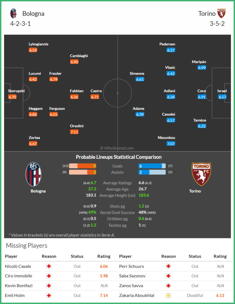1. 점유 vs 직접 공격 : 볼로냐는 점유율 중심의 패스 전개, 토리노는 롱볼과 크로스를 활용한 단도직입형 공격을 개시할 것이다. 볼로냐가 경기의 리듬을 주도하겠지만, 토리노의 단발적인 공격 전환은 충분히 위협적일 것.