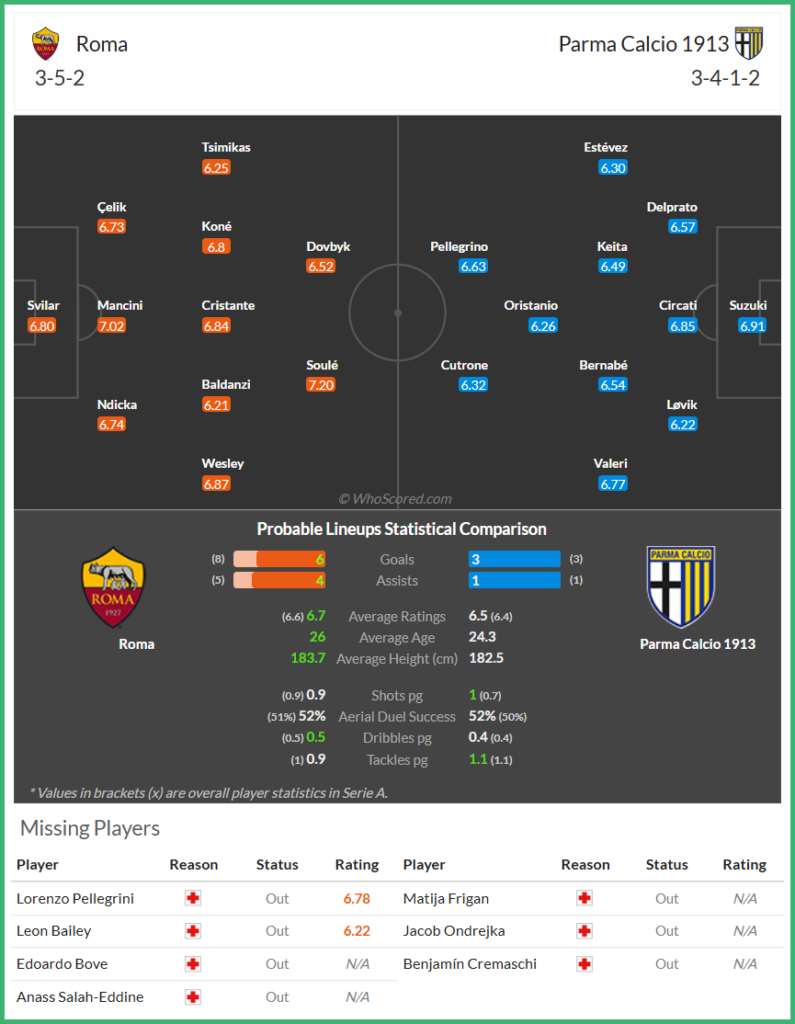 2. 세트피스 : 양 팀 모두 공중볼 경합, 세트피스 상황에서 강점을 가지고 있다. 특히 파르마는 세트피스 공격 의존도가 높고, 로마는 세트피스 수비 상황에서도 안정적인 모습을 보여주기 때문에 이 대결이 경기 결과에 큰 영향을 줄 것으로 보인다.