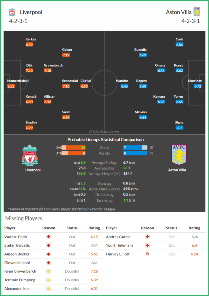 3. 세트피스 : 빌라는 세트피스 수비에서 약점을 보이고, 리버풀은 반 다이크, 흐라벤베르흐, 소보슬러이 등, 제공권과 프리킥(중거리)에 능한 선수들이 많이 포진되어 있다.