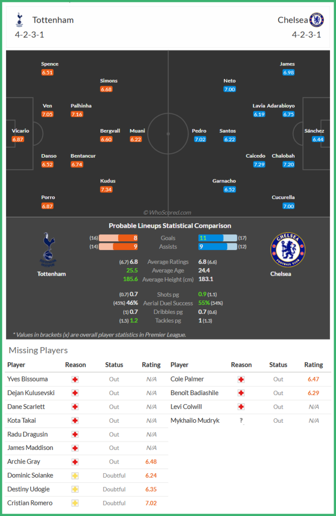 1. 측면 싸움 : 두 팀 모두 측면 자원(토트넘-포로, 쿠두스, 시몬스/첼시-네투,가르나초,리스 제임스)을 기반으로 공격을 전개한다. 차이점이 있다면 토트넘은 역습, 첼시는 1대 1 돌파. 즉 드리블러 수비가 약한 토트넘과 역습 수비에 약한 첼시를 고려했을 때, 양 팀 모두 상대의 약점을 파고 들 수 있음을 알 수 있다. 측면에서 우세를 잡는 팀이 경기 주도권을 가져갈 확률이 높다.