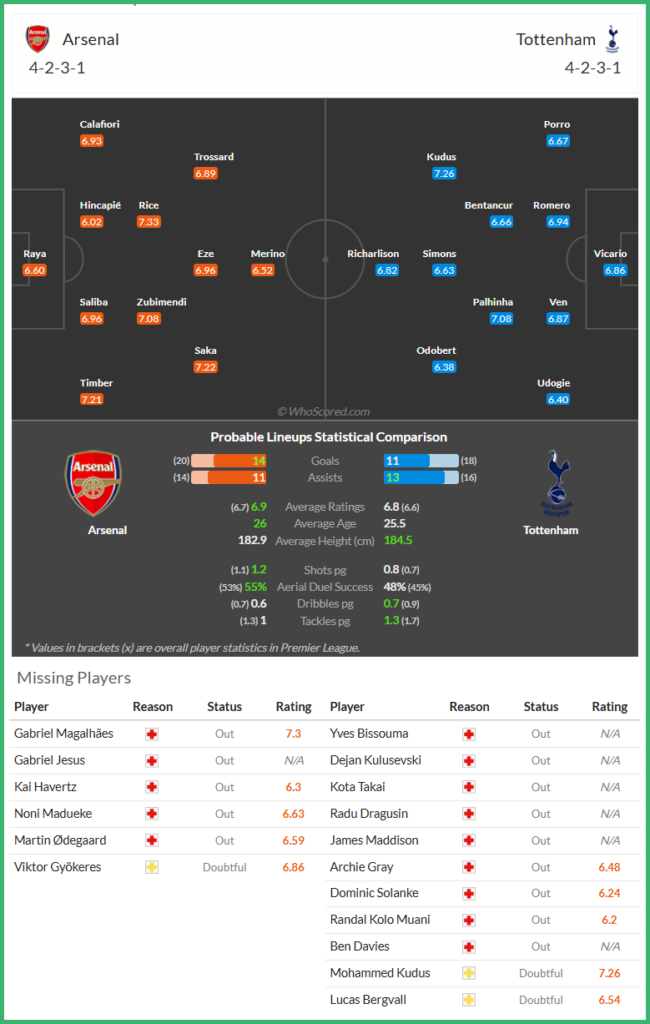 아스날은 세트피스 및 스루패스를 통해 토트넘의 높은 라인 뒷공간을, 토트넘은 강한 전진 압박과 측면 돌파를 중심으로 템포를 끌어올릴 것이다.
