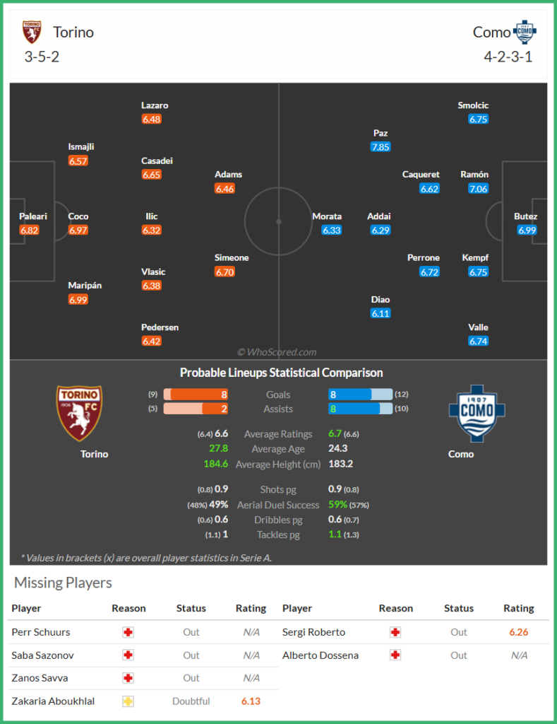 전반은 코모가 점유율을 주도하며 안정적으로 빌드업을 하고, 토리노는 롱볼·측면 크로스로 빠르게 답하는 흐름이 될 가능성이 높다. 코모는 중앙 침투 및 중거리를 주 공격 루트로 삼을 것이다.