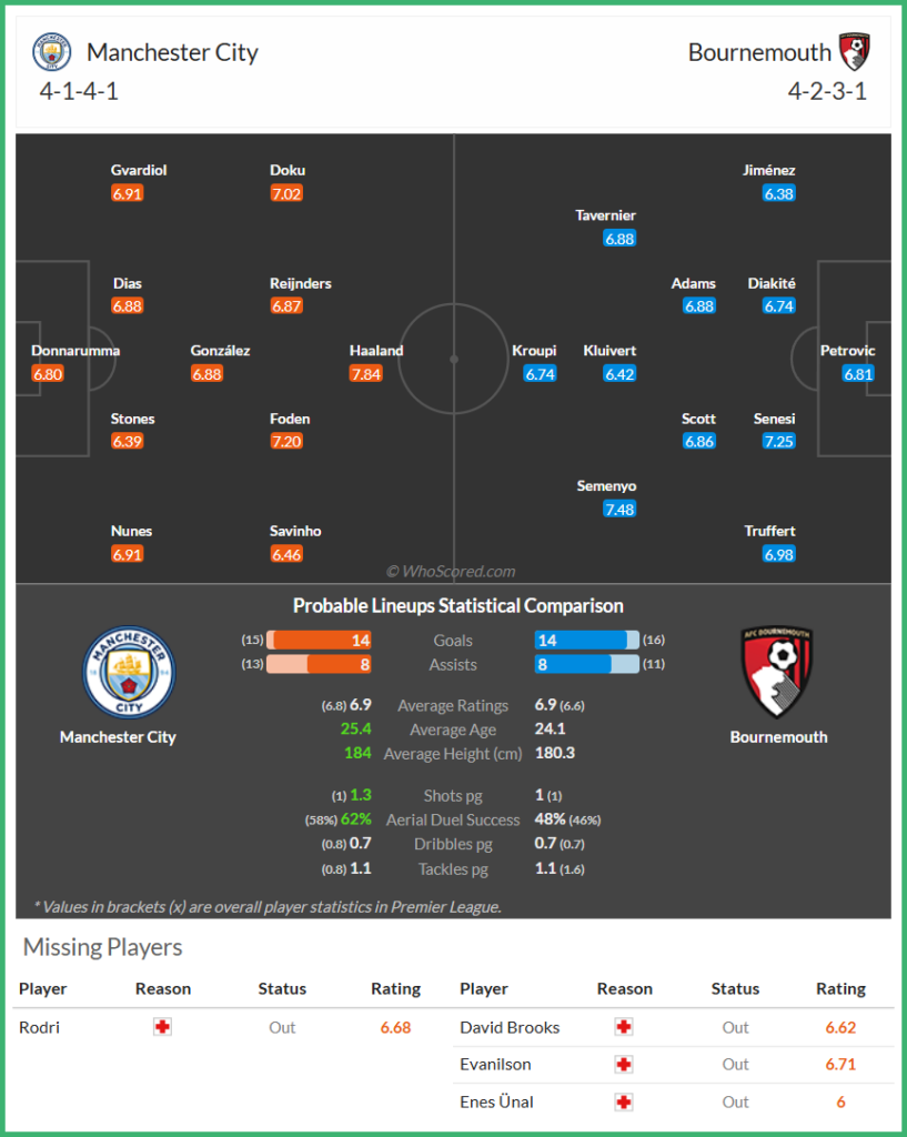 - 경기 양상 예측 : [전반] 맨시티가 점유율을 지배, 본머스는 간헐적인 역습 외에는 수비에 집중. 맨시티는 4명의 2선 자원들이 연계를 통해 하프스페이스를 공략할 예정 → [후반] 시티가 측면과 중앙을 파고들며 경기 지배력이 더 커질 전망. 본머스는 체력 저하와 수비 라인 붕괴로 홀란드에게 많은 득점을 내 줄 가능성이 높음