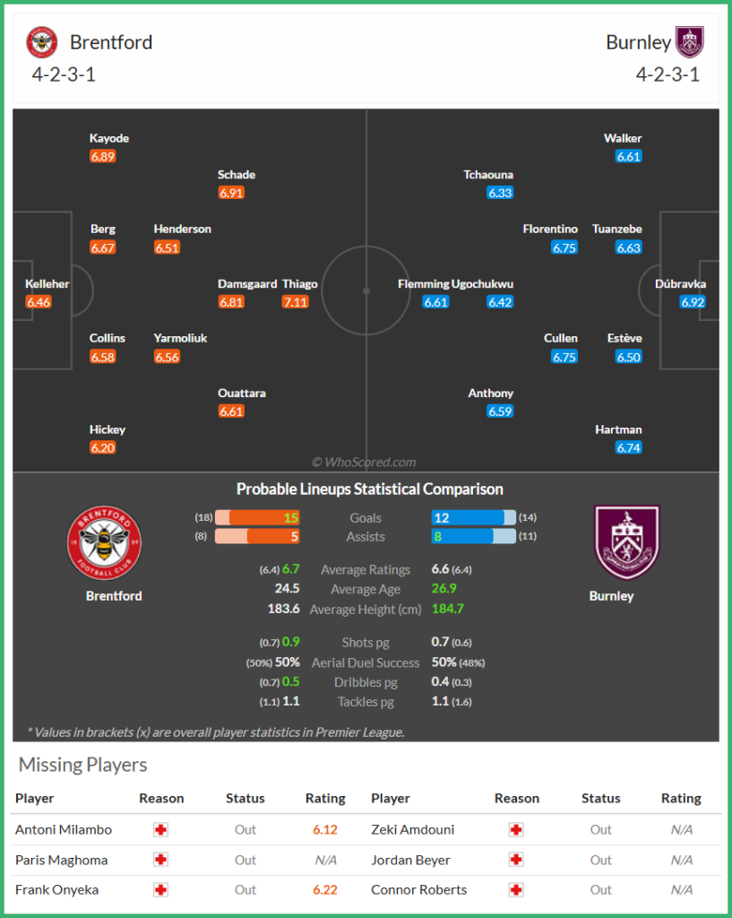 한국시간 11월 9일 EPL 13라운드 브렌트포드 FC vs 번리 FC 경기 예상 라인업 / 출처 : 후스코어드닷컴