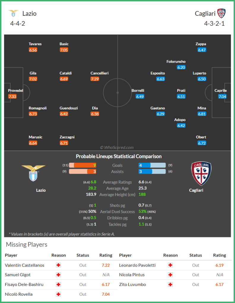 - 예상 스코어 : [라치오 2 – 1 칼리아리]