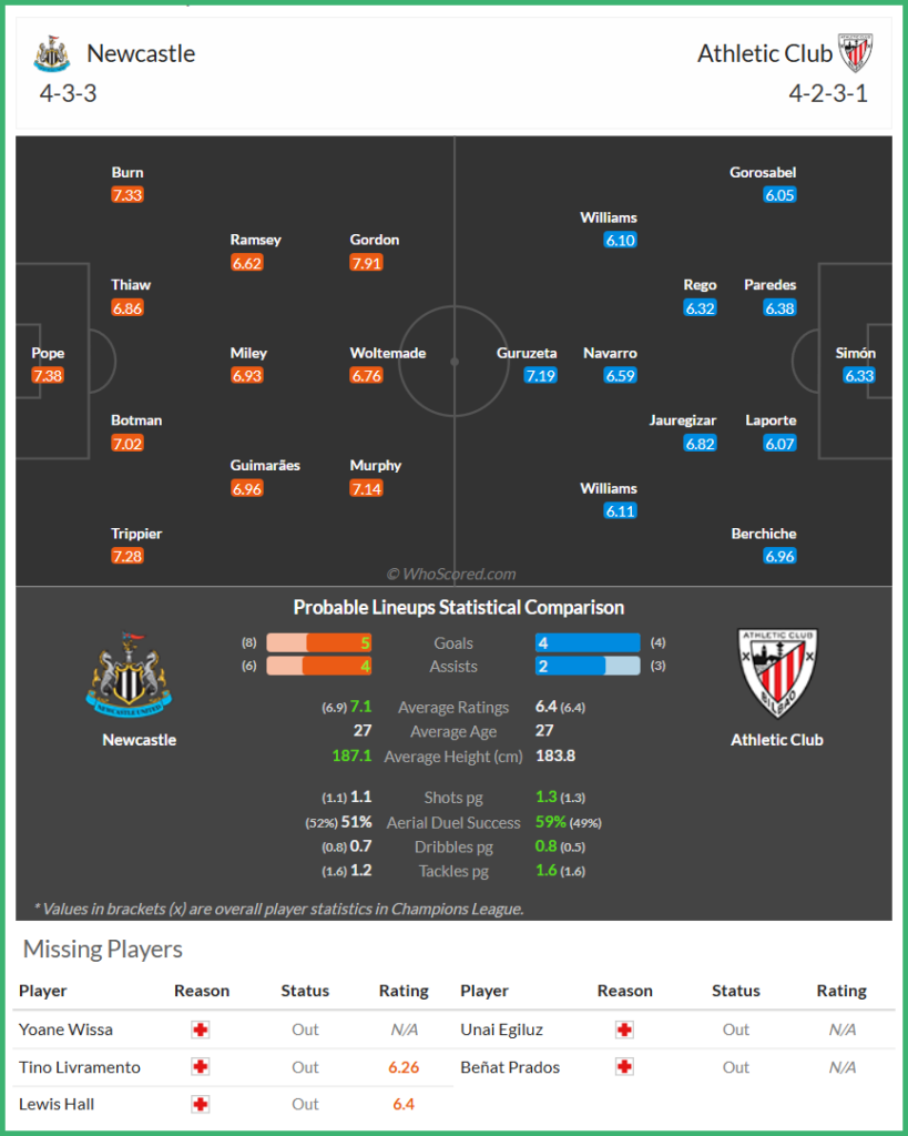 한국시간 11월 6일 UEFA 챔피언스리그 리그 페이즈 뉴캐슬 유나이티드 FC vs 아틀레틱 빌바오 경기 예상 라인업 / 출처 : 후스코어드닷컴