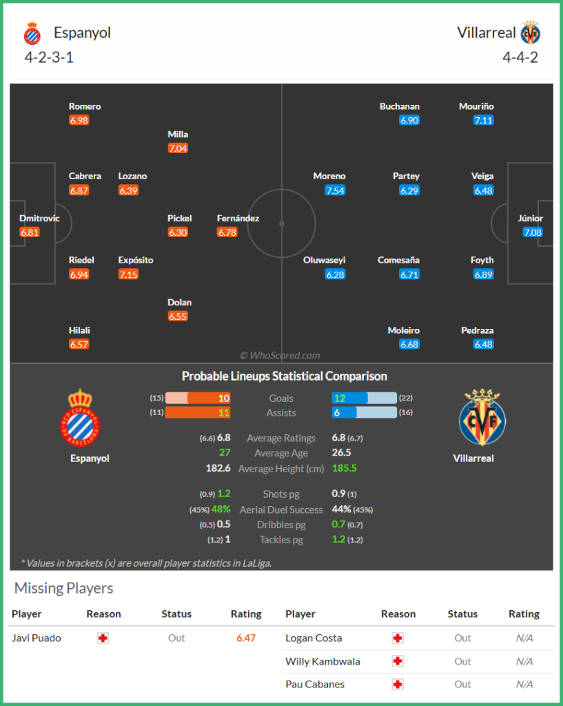 한국시간 11월 9일 라리가 12라운드 RCD 에스파뇰 vs 비야레알 CF 경기 예상 라인업 / 출처 : 후스코어드닷컴