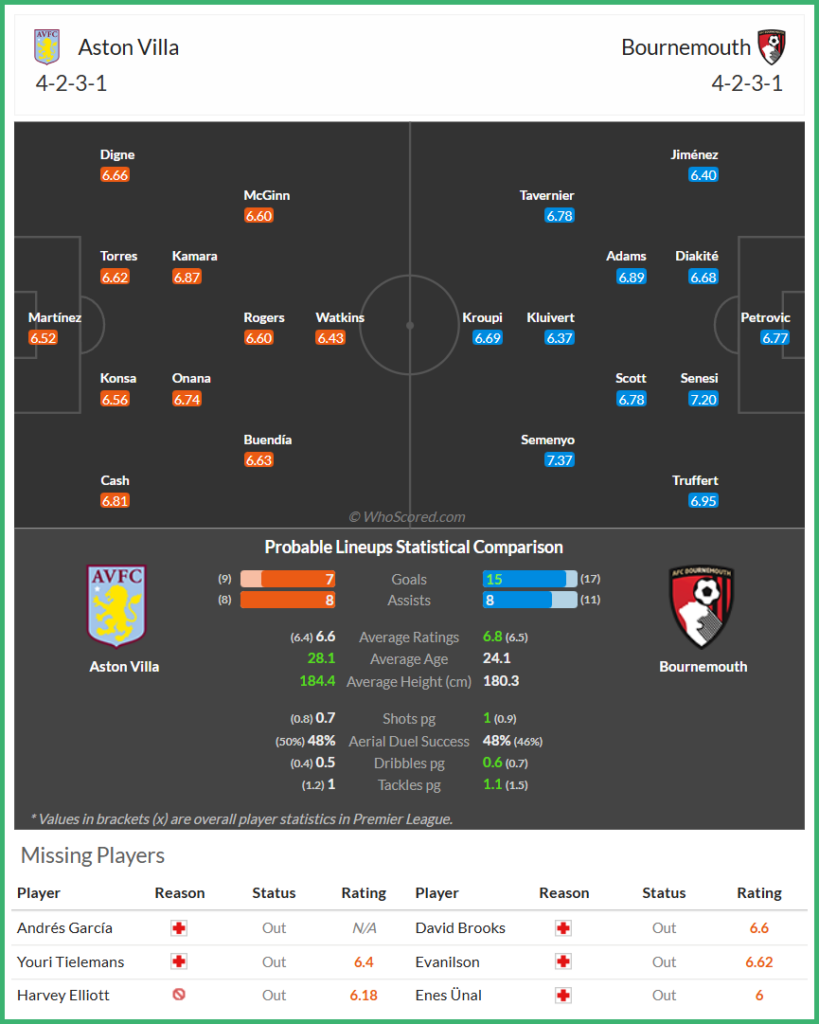 한국시간 11월 9일 EPL 11라운드 아스톤 빌라 FC vs AFC 본머스 경기 예상 라인업 / 출처 : 후스코어드닷컴