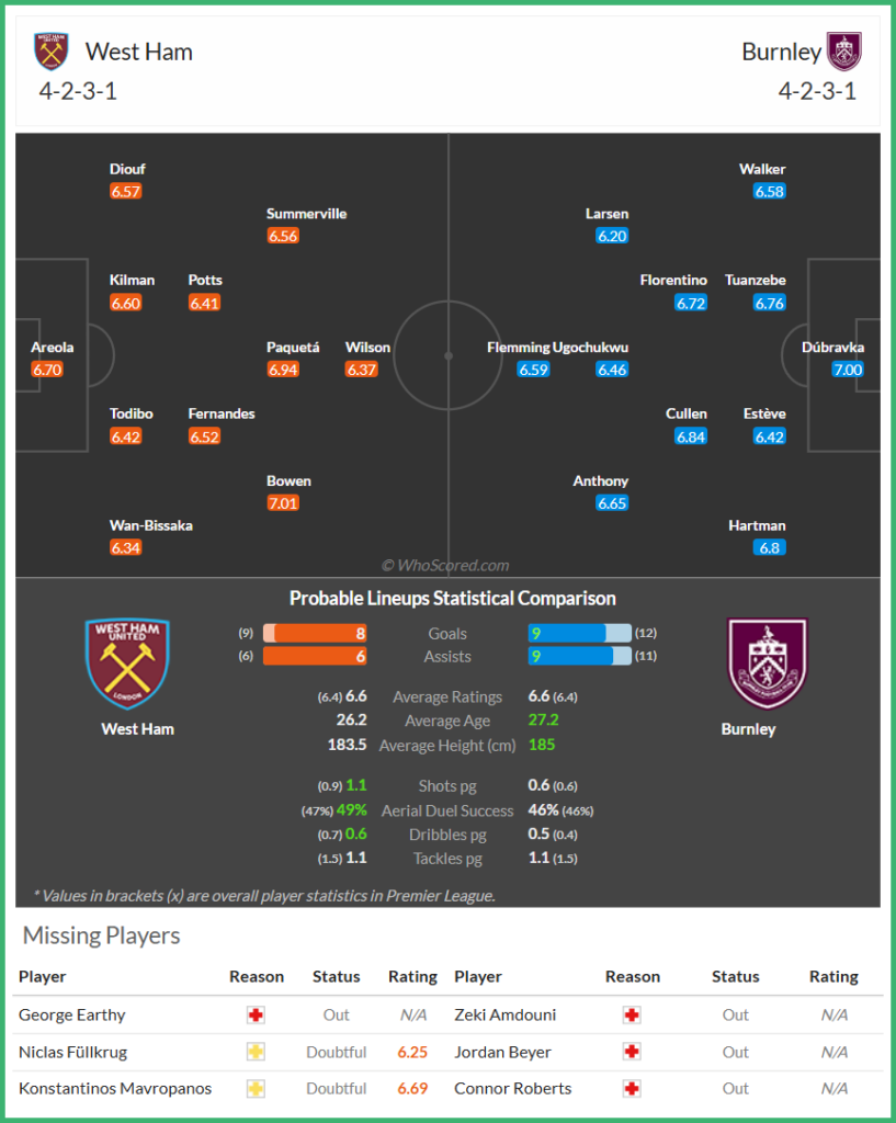한국시간 11월 9일 EPL 11라운드 웨스트햄 유나이티드 FC vs 번리 FC 경기 예상 라인업 / 출처 : 후스코어드닷컴