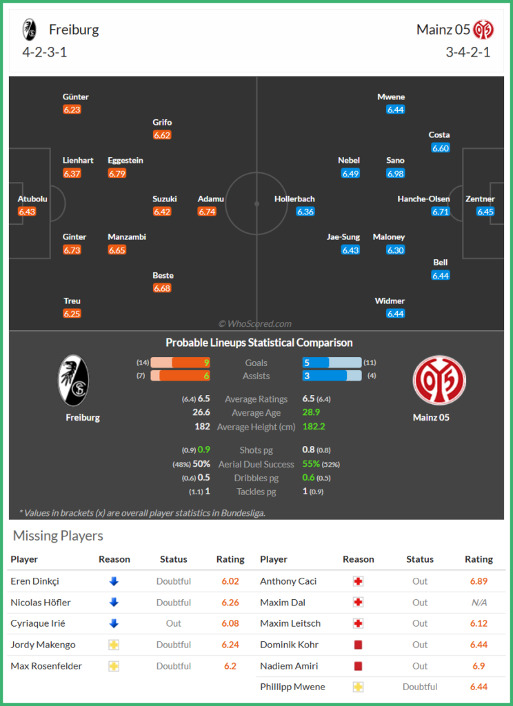 한국시간 12월 1일 분데스리가 12라운드 SC 프라이부르크 vs 1. FSV 마인츠 05 경기 예상 라인업 / 출처 : 후스코어드닷컴