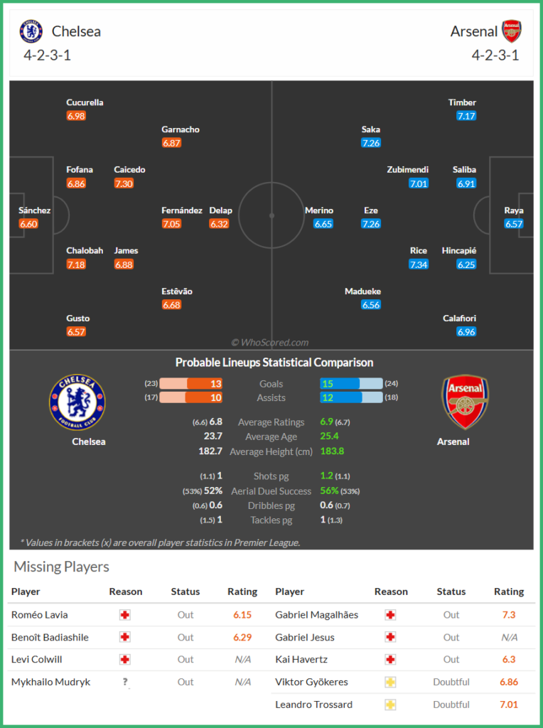 2. 측면 싸움 : 첼시는 좌·우 측면에서의 드리블·속도를 이용한 돌파, 아스날은 오른쪽(사카)를 활용한 공격 패턴이 중심 → 측면 싸움이 잦아질 것