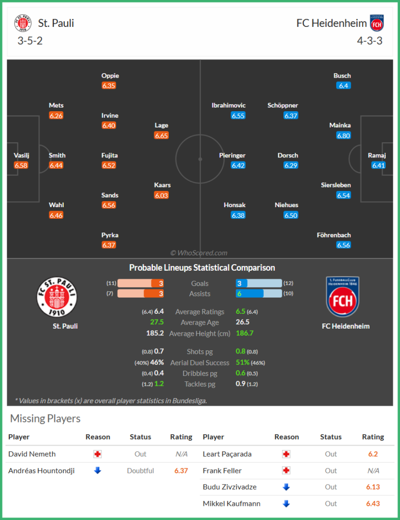 - 예상 스코어 : [장크트파울리 2 – 0 하이덴하임]