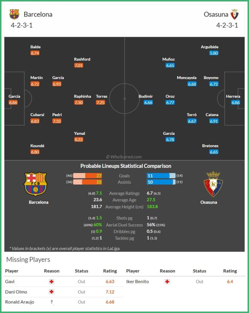 → 바르셀로나는 점유율에서 압도할 것. 빌드업 능력이 약한 오사수나는 롱볼 위주로 전개할 것이다.