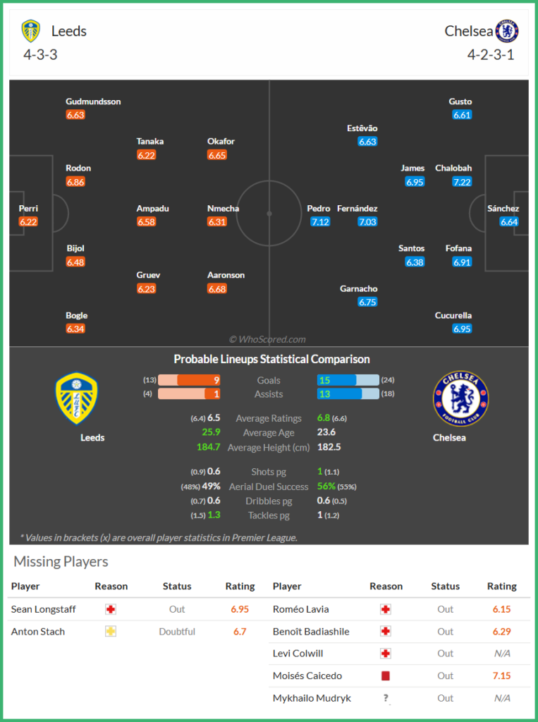 1. 리즈의 약점이 첼시의 강점과 충돌 : 리즈 유나이티드는 스루패스와 테크니컬한 선수의 돌파를 대응하지 못하는게 큰 단점인데, 이는 첼시의 강점과 충돌한다. 첼시는 리스 제임스의 중앙 돌파 및 스루패스, 측면 자원들(쿠쿠레야, 에스테방) 등의 돌파로 찬스를 만들어내는 팀이다.
