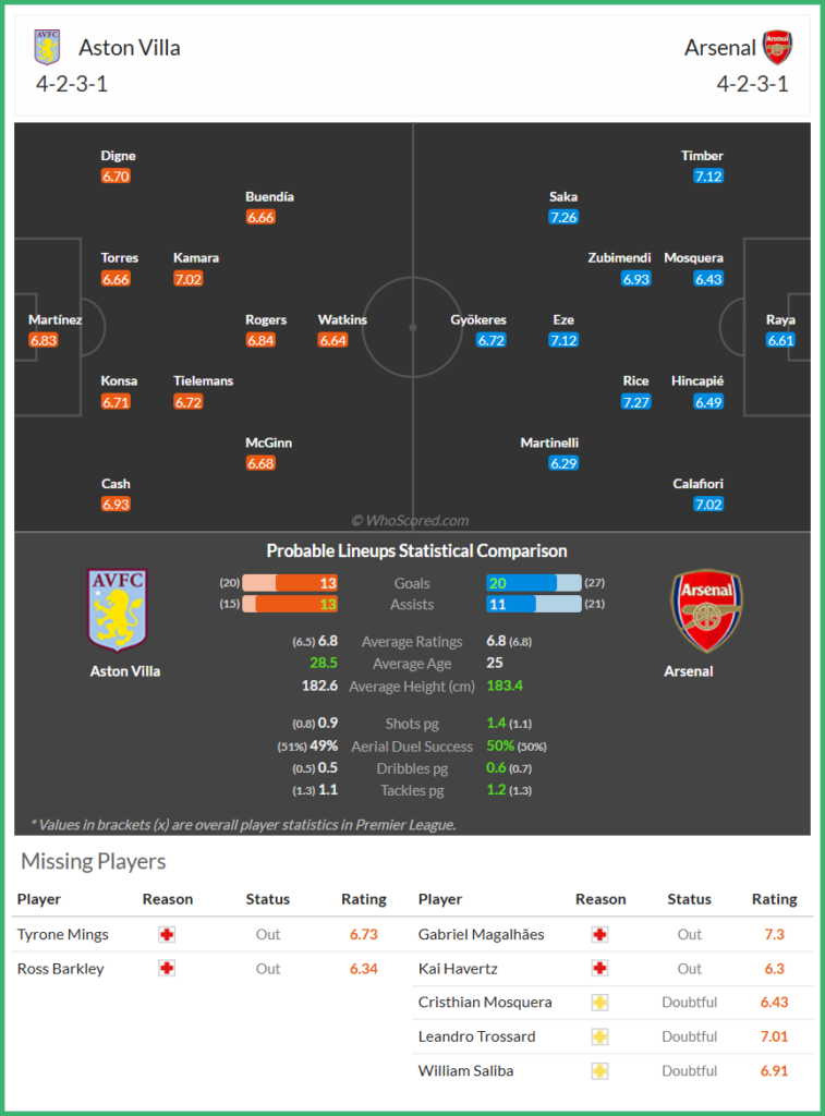 - 경기 양상은 팽팽하나, 아스날이 빌라의 박스 근처에서 더 위협적인 모습을 보여줄 것으로 예상