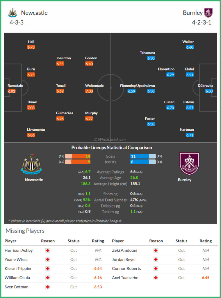 한국시간 12월 7일 EPL 15라운드 뉴캐슬 유나이티드 FC vs 번리 FC 경기 예상 라인업 / 출처 : 후스코어드닷컴