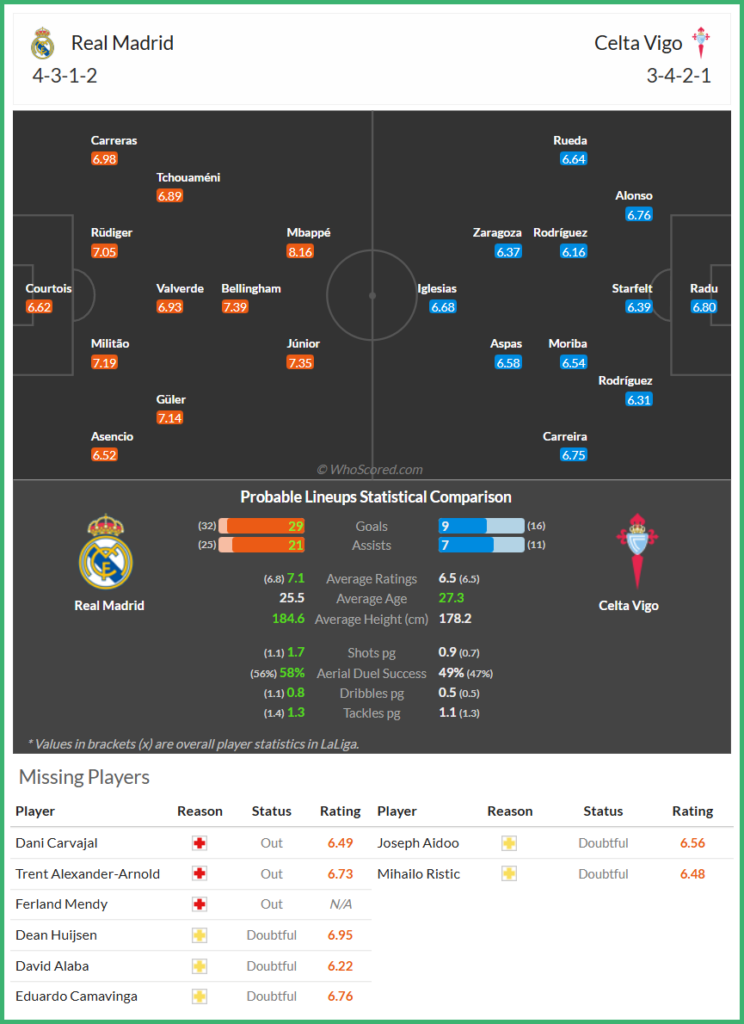 12월 8일 라리가 레알 마드리드 셀타 비고 예상 라인업, AI 분석, 결과 예측
