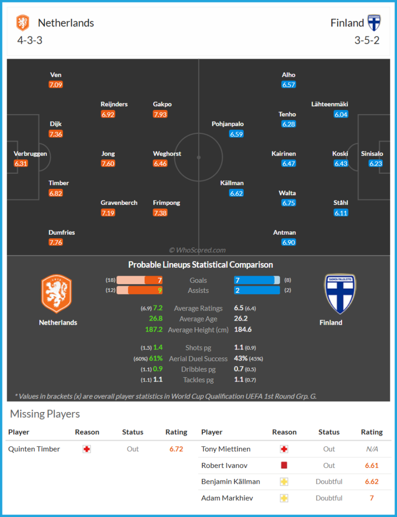 - 예상 스코어 : [네덜란드 2 – 0 핀란드]
